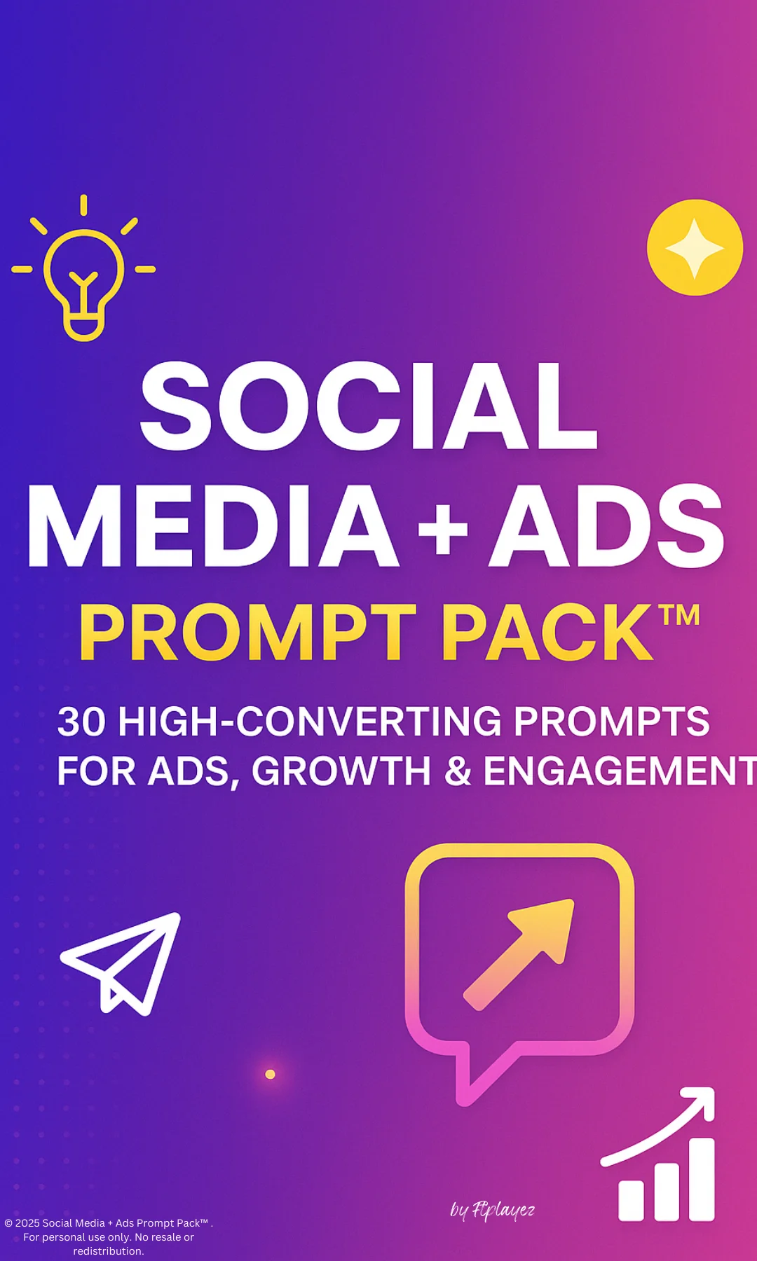 The Social Media + Ads Prompt Pack™ gives you 30 expert-crafted ChatGPT prompts designed to instantly boost your content quality, reach, and conversions — saving you hours of brainstorming while giving your social media a professional edge.